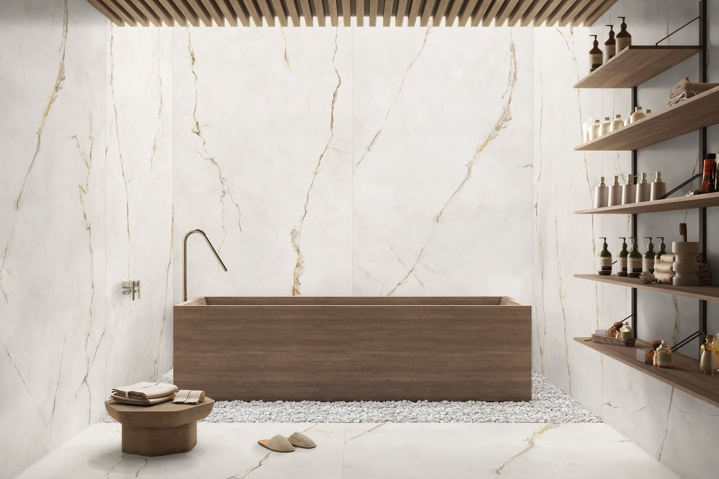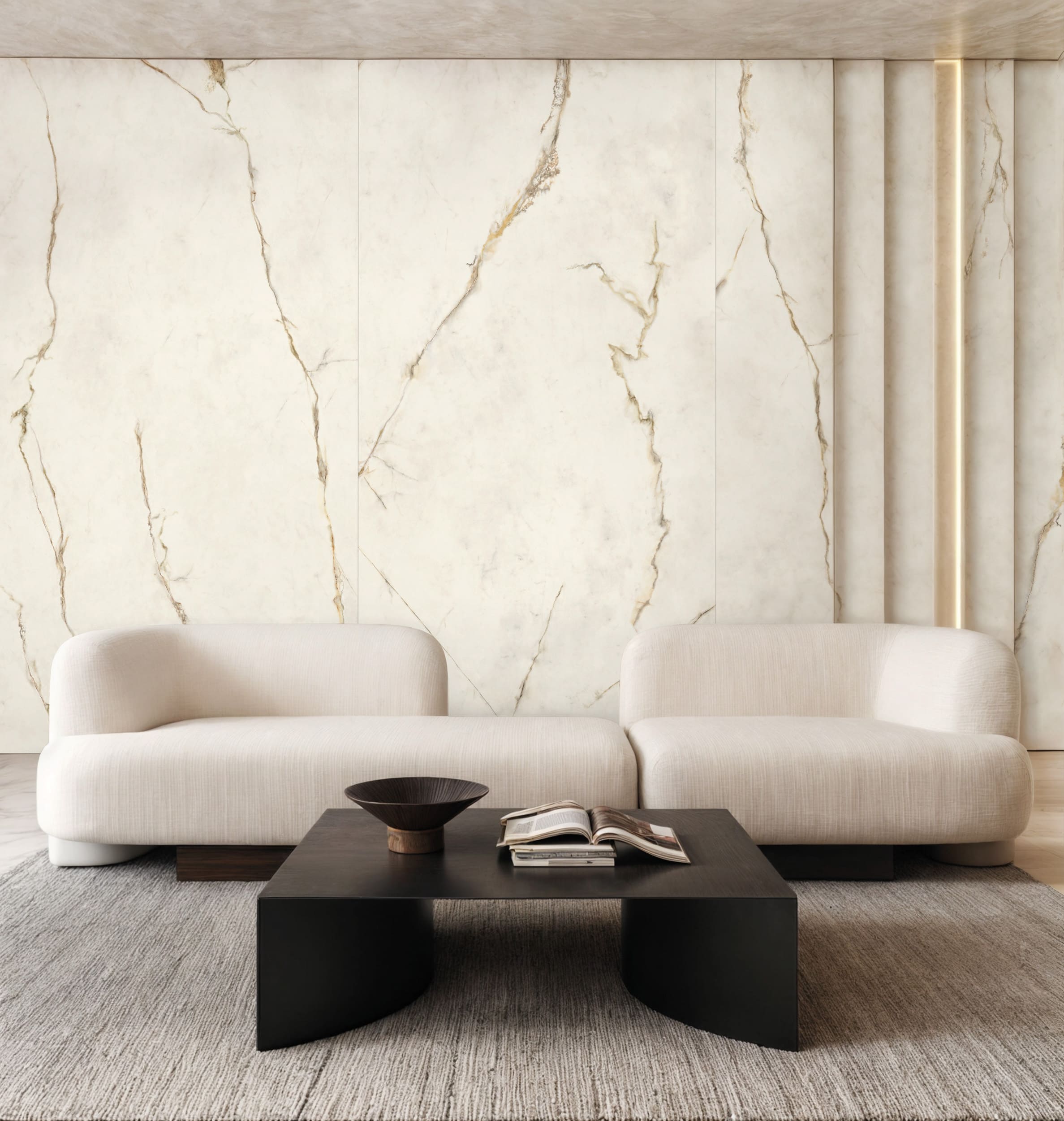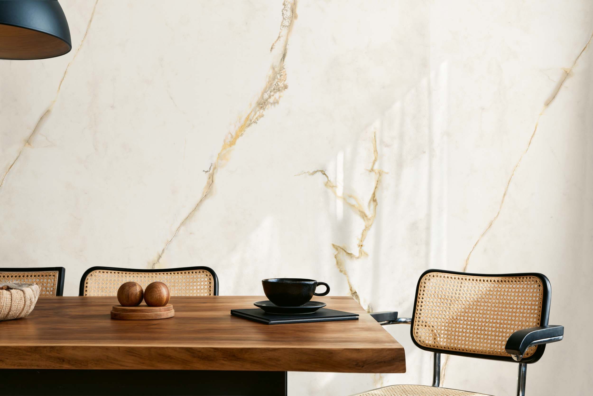 Коллекция Dubai Gold воплощает роскошь одноименного мрамора с его характерными золотистыми прожилками. Теплые бежевые и песочные тона фона создают мягкий контраст с мерцающими акцентами, напоминающими позолоту. Благодаря игре света на рельефной поверхности плитка передает эффект драгоценного материала, делая ее идеальным решением для статусных интерьеров, где важны теплота, сияние и ощущение роскоши.